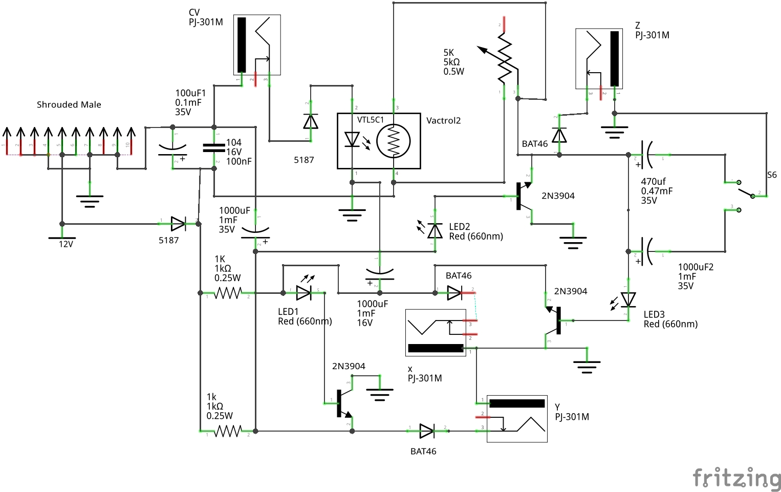 I’ve basically concentrated on scaling the big caps (up to 3300 uF to this point). It’s still quiete a ‘fast’ CV generator. But I’ve found that it has 3 regions of chaos and a number os interesting wonky lfos that work nicely.