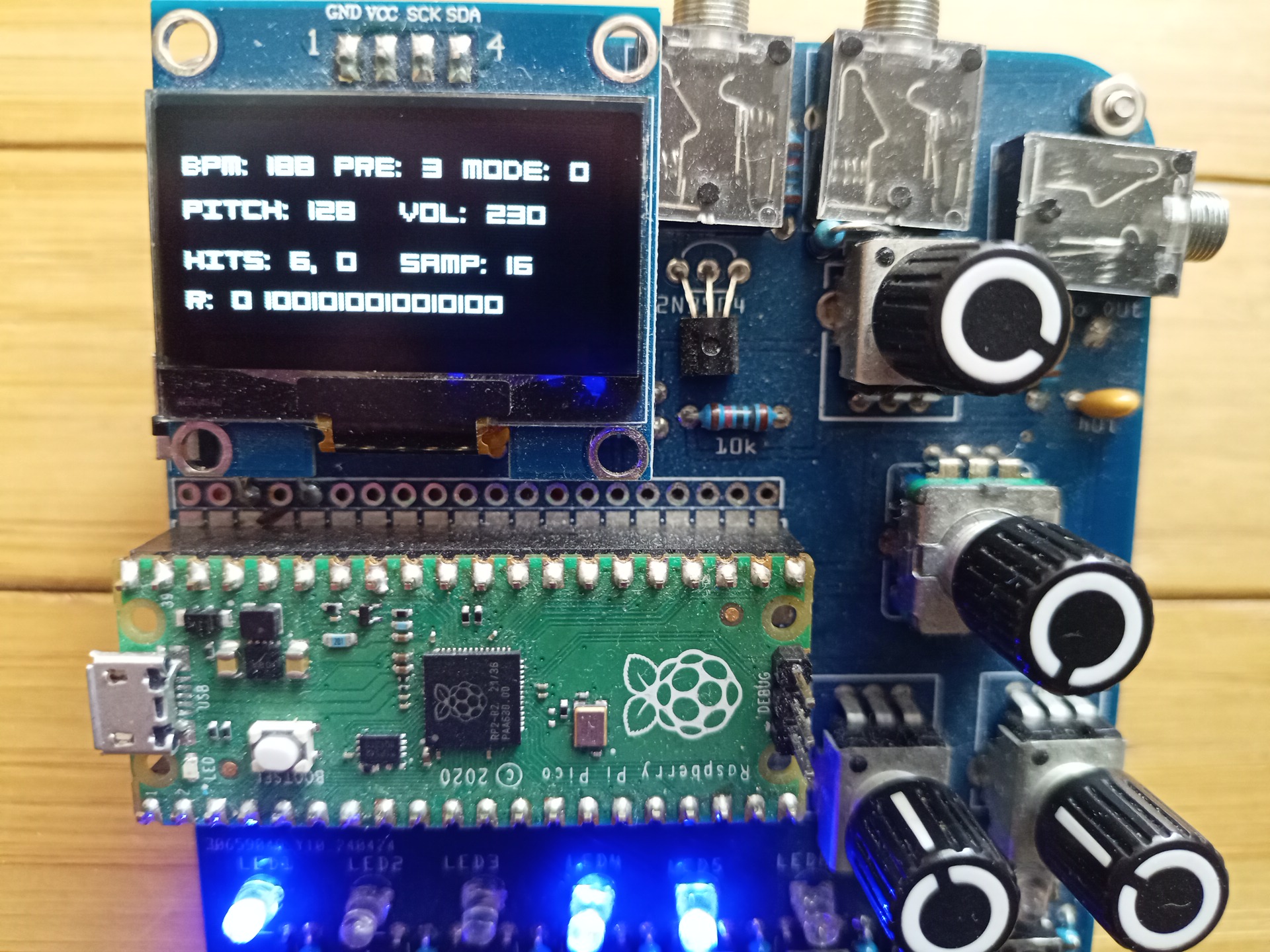 On booting, pikobeatbox starts in mode ‘0’ with several samples running patterns from the last saved preset (or defaults from firmware).